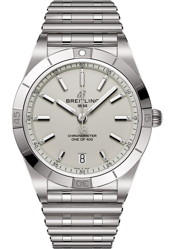 36.0 mm stainless steel case, 10.0 mm thick, non screw-locked crown with two gaskets, unidirectional ratcheted bezel, cambered sapphire crystal with glareproof treatment on both sides, dove grey dial, Breitling 10 self-winding movement, approximately 42 hours of power reserve, stainless steel bracelet. Water resistant to 10 bars.