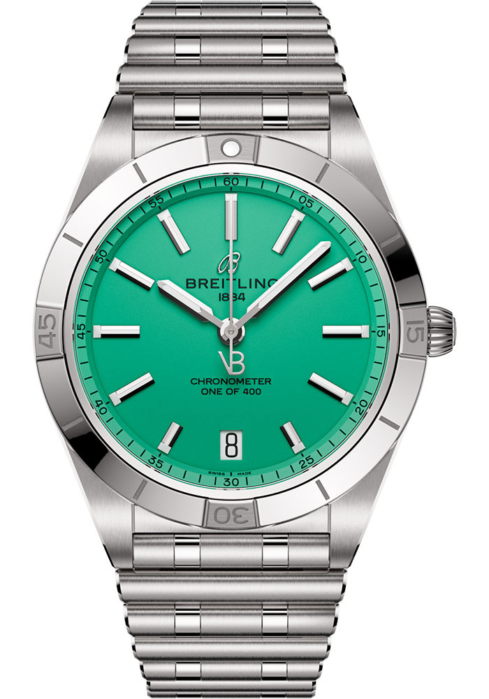 36.0 mm stainless steel case, 10.0 mm thick, non screw-locked crown with two gaskets, unidirectional ratcheted bezel, cambered sapphire crystal with glareproof treatment on both sides, peppermint dial, Breitling 10 self-winding movement, approximately 42 hours of power reserve, stainless steel bracelet. Water resistant to 10 bars.