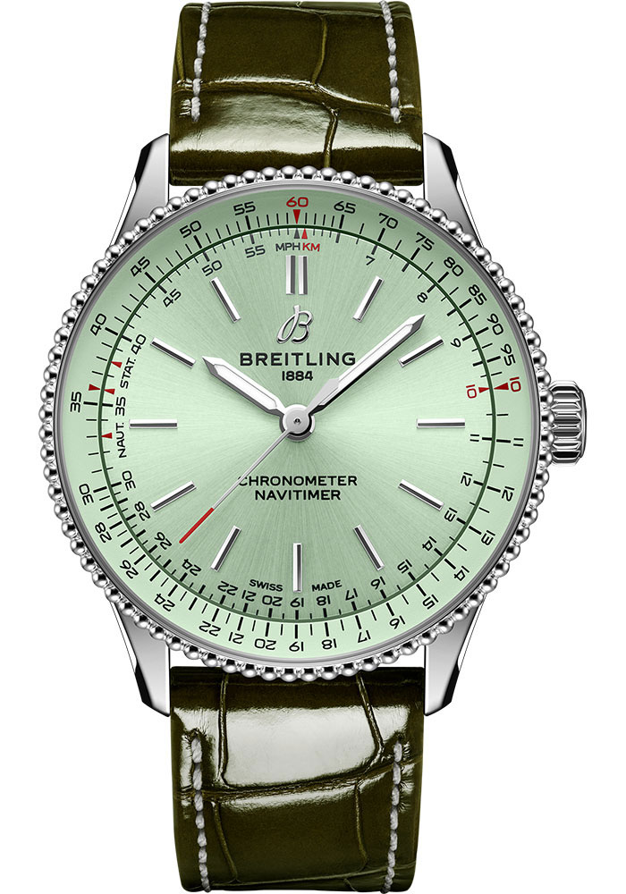 36.0 mm stainless steel case, 11.4 mm thick, non screw-locked crown with two gaskets, bidirectional slide rule bezel, cambered sapphire crystal with glareproof treatment on both sides, mint green dial, Breitling 17 self-winding movement, approximately 38 hrs of power reserve, green alligator leather strap, folding buckle. Water resistant to 3 bars.