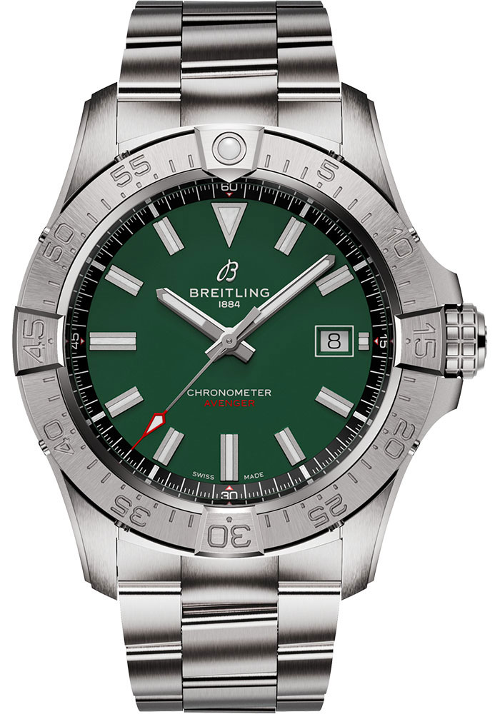 42.0 mm stainless steel case, 12.1 mm thick, screw-locked crown with two gaskets, unidirectional ratcheted bezel, cambered sapphire crystal with glareproof treatment on both sides, green dial, Breitling 17 self-winding movement, approximately 38 hrs of power reserve, stainless steel bracelet. Water resistant to 300 m (1,000 ft).
