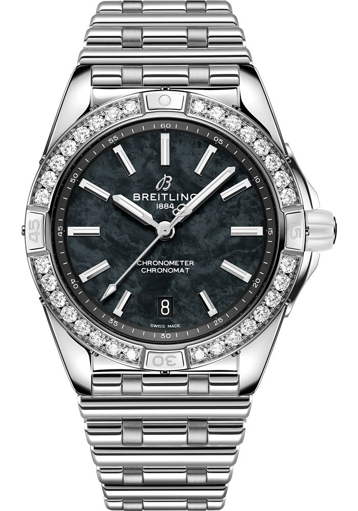 38.0 mm stainless steel case, 11.88 mm mm thick, non screw-locked crown with two gaskets, super from the rest of the chronomat family by the ceramic rider tabs and crown and the rubber rouleaux bracelet only available with this supercharged line. aside from its enhanced presence the automatic 38 also has a radiant side. oversized lab-grown diamonds make the rounds of its 18k red gold or stainless-steel unidirectional ratcheted bezel, convex sapphire crystal with glareproof treatment on both sides, blue dial, Breitling 17 self-winding movement, approximately 38 hrs of power reserve, stainless steel bracelet. Water resistant to 10 bars.