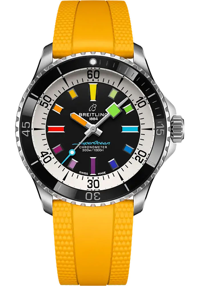 42.0 mm stainless steel case, 12.56 mm thick, screw-locked crown with two gaskets, unidirectional ratcheted bezel, cambered sapphire crystal with glareproof treatment on both sides, black dial, Breitling 17 self-winding movement, approximately 38 hrs of power reserve, yellow rubber strap, folding buckle. Water resistant to 300 m (1,000 ft).