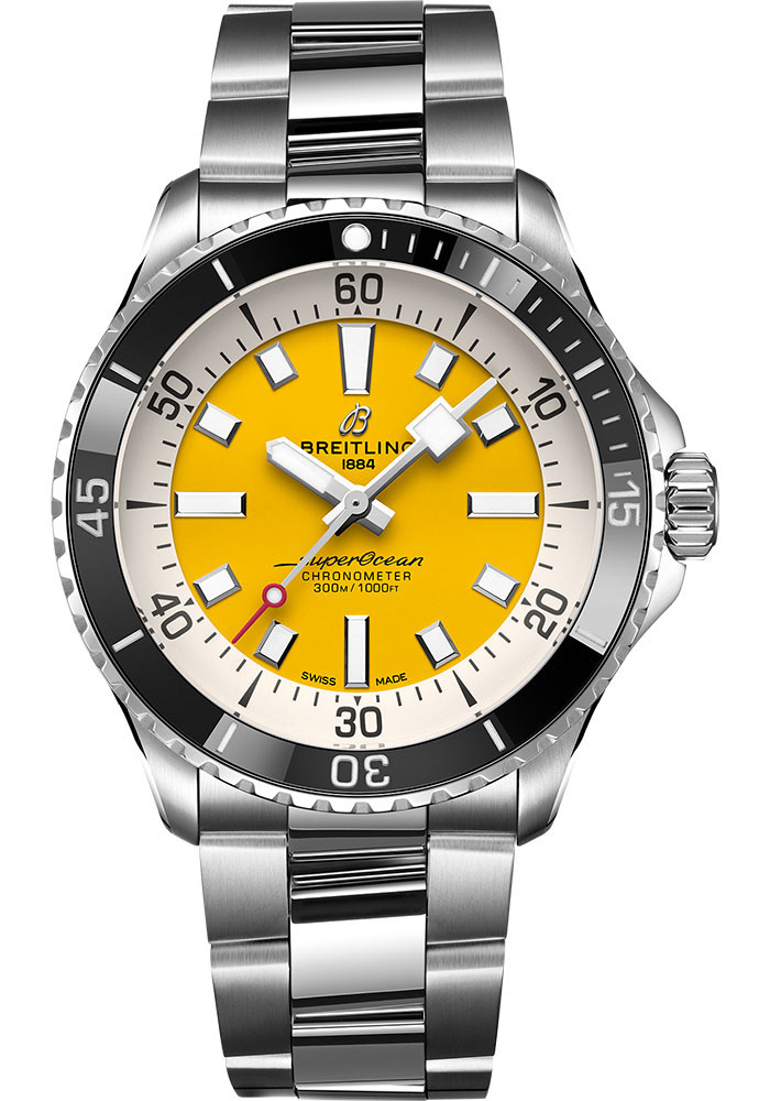 42.0 mm stainless steel case, 12.5 mm thick, screw-locked crown with two gaskets, unidirectional ratcheted bezel, cambered sapphire crystal with glareproof treatment on both sides, yellow dial, Breitling 17 self-winding movement, approximately 38 hrs of power reserve, stainless steel bracelet. Water resistant to 300 m (1,000 ft).
