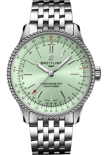 35.0 mm stainless steel case, 9.9 mm thick, non screw-locked crown with two gaskets, bidirectional slide rule bezel, cambered sapphire crystal with glareproof treatment on both sides, mint green dial, Breitling 17 self-winding movement, approximately 38 hrs of power reserve, stainless steel bracelet. Water resistant to 3 bars.