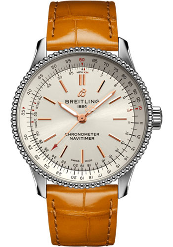 35.0 mm stainless steel case, 9.9 mm thick, non screw-locked crown with two gaskets, bidirectional slide rule bezel, cambered sapphire crystal with glareproof treatment on both sides, silver dial, Breitling 17 self-winding movement, approximately 38 hrs of power reserve, gold brown alligator leather strap, tang buckle. Water resistant to 3 bars.