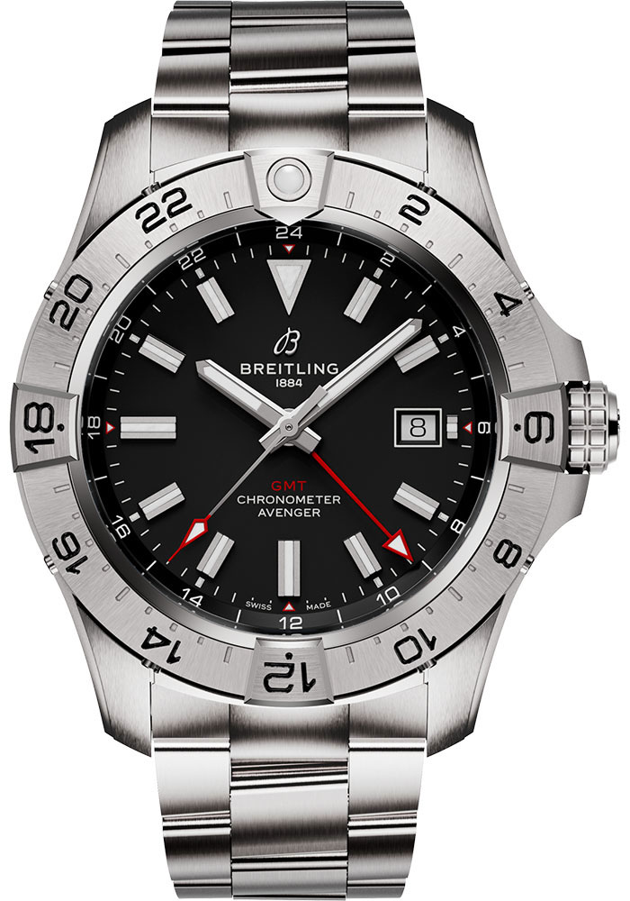 44.0 mm stainless steel case, 12.0 mm thick, screw-locked crown with two gaskets, rotating pinion bezel with 24-timezone indication, cambered sapphire crystal with glareproof treatment on both sides, black dial, Breitling 32 self-winding movement, approximately 42 hours of power reserve, stainless steel bracelet. Water resistant to 300 m (1,000 ft).