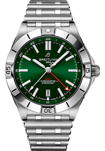 40.0 mm stainless steel case, 11.77 mm mm thick, screw-locked crown with two gaskets, unidirectional ratcheted rotating bezel, cambered sapphire crystal with glareproof treatment on both sides, green dial, Breitling 32 self-winding movement, approximately 42 hours of power reserve, stainless steel bracelet. Water resistant to 200 m (660 ft).