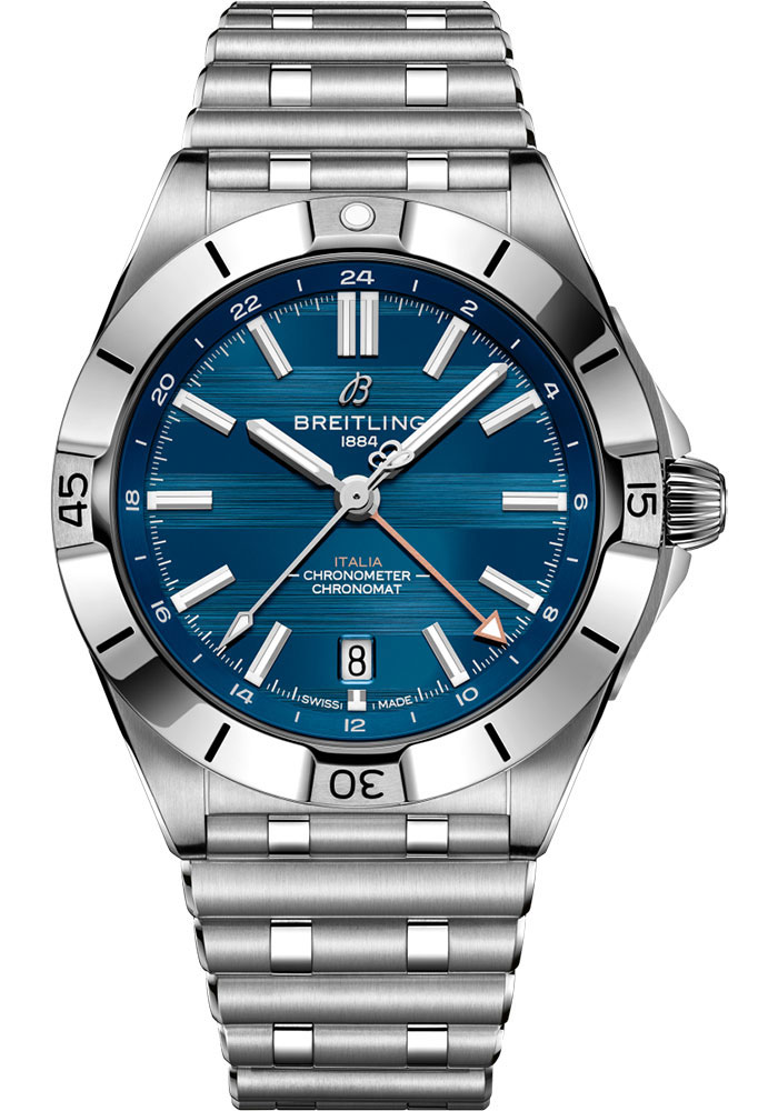 40 mm stainless steel case, 11.77 mm thick, screw-locked crown with two gaskets, unidirectional ratcheted rotating bezel, cambered sapphire crystal with glareproof treatment on both sides, blue dial, Breitling 32 self-winding movement, approximately 42 hours of power reserve, stainless steel bracelet. Water resistant to 200 m (660 ft).