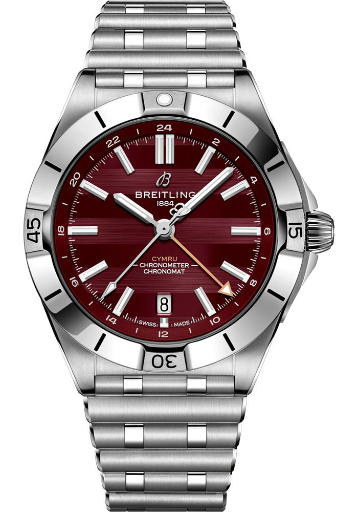 40 mm stainless steel case, 11.77 mm thick, screw-locked crown with two gaskets, unidirectional ratcheted rotating bezel, cambered sapphire crystal with glareproof treatment on both sides, burgundy dial, Breitling 32 self-winding movement, approximately 42 hours of power reserve, stainless steel bracelet. Water resistant to 200 m (660 ft).