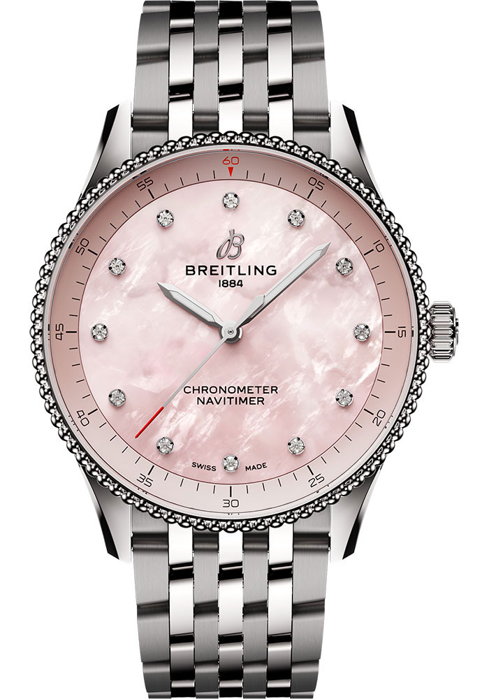 32.0 mm stainless steel case, 8.0 mm thick, non screw-locked crown with two gaskets, fixed bezel, cambered sapphire crystal with glareproof treatment on both sides, pink mother-of-pearl dial, Breitling 77 thermocompensated SuperQuartz™ movement, stainless steel bracelet. Water resistant to 5 bars.