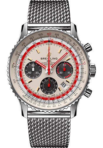 41.0 mm 18K red gold case, 13.6 mm thick, transparent sapphire crystal back, non screw-locked crown with two gaskets, bidirectional slide rule bezel, cambered sapphire crystal with glareproof treatment on both sides, silver dial, Breitling 01 (Manufacture) self-winding movement, approximately 70 hrs of power reserve, black alligator leather strap, folding buckle. Water resistant to 3 bars.