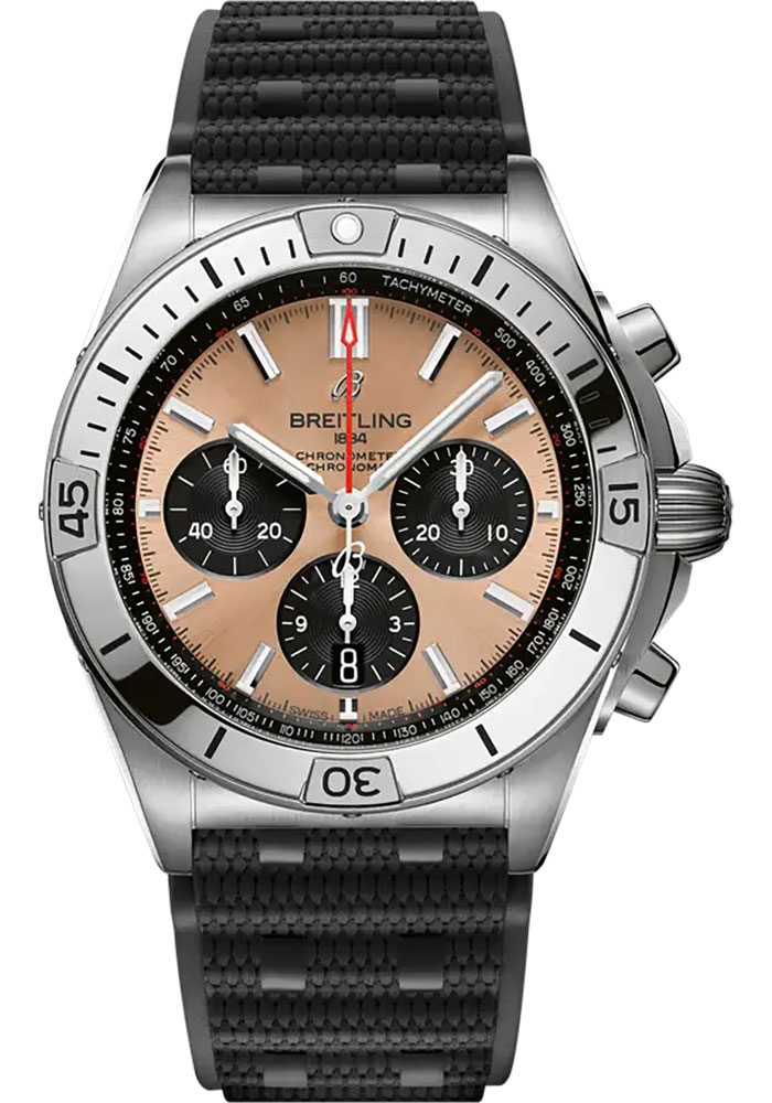 42.0 mm stainless steel case, 15.10 mm thick, transparent sapphire crystal back, screw-locked crown with two gaskets, unidirectional ratcheted bezel, cambered sapphire crystal with glareproof treatment on both sides, copper dial, Breitling 01 (Manufacture) self-winding movement, approximately 70 hrs of power reserve, black rubber strap, folding buckle. Water resistant to 200 m (660 ft).