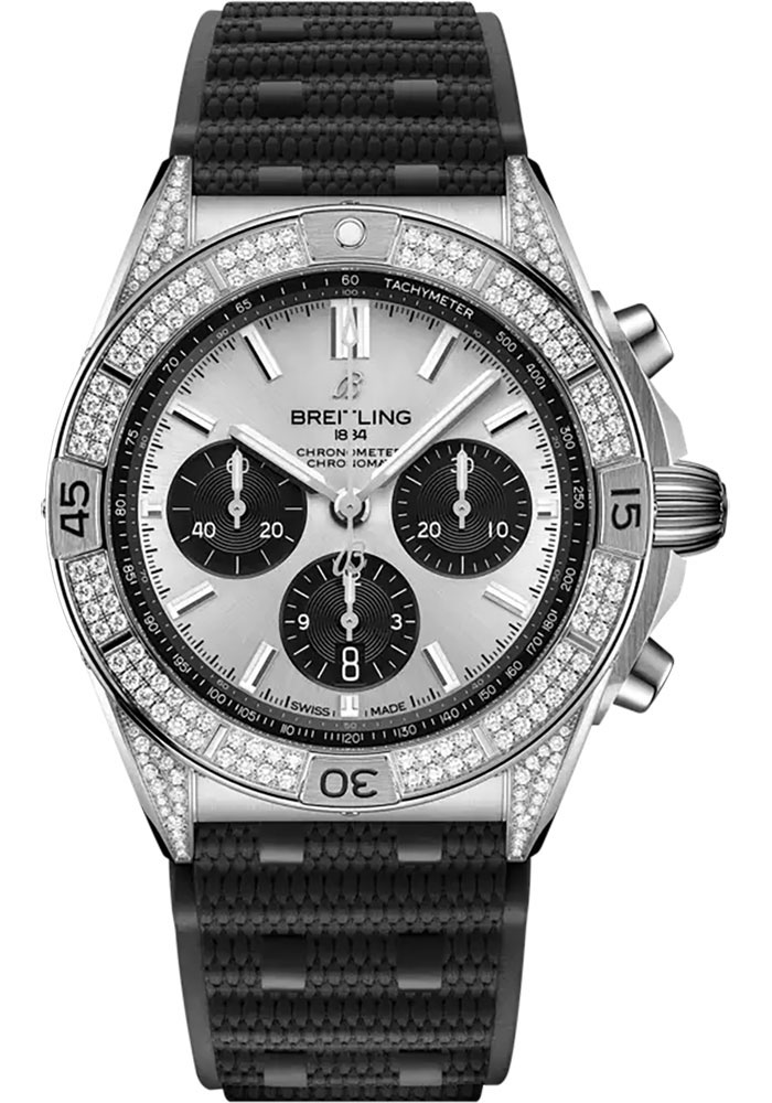 42.0 mm stainless steel (gem-set) case, 15.10 mm thick, transparent sapphire crystal back, screw-locked crown with two gaskets, unidirectional ratcheted bezel, cambered sapphire crystal with glareproof treatment on both sides, cream dial, Breitling 01 (Manufacture) self-winding movement, approximately 70 hrs of power reserve, black rubber strap, folding buckle. Water resistant to 200 m (660 ft).