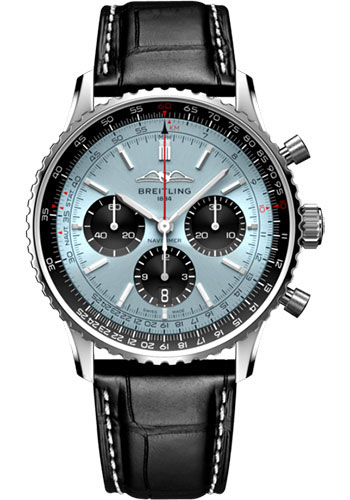 43.0 mm stainless steel case, 13.6 mm thick, transparent sapphire crystal back, non screw-locked crown with two gaskets, bidirectional slide rule bezel, cambered sapphire crystal with glareproof treatment on both sides, ice blue dial, Breitling 01 (Manufacture) self-winding movement, approximately 70 hrs of power reserve, black alligator leather strap, folding buckle. Water resistant to 3 bars.