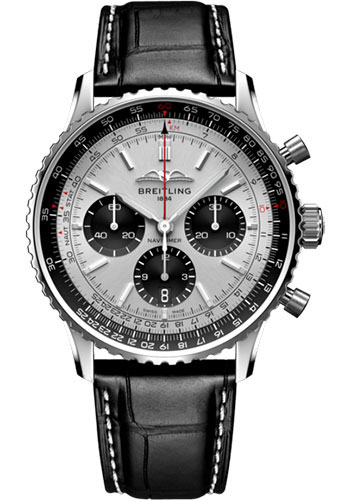 43.0 mm stainless steel case, 13.6 mm thick, transparent sapphire crystal back, non screw-locked crown with two gaskets, bidirectional slide rule bezel, cambered sapphire crystal with glareproof treatment on both sides, silver dial, Breitling 01 (Manufacture) self-winding movement, approximately 70 hrs of power reserve, black alligator leather strap, folding buckle. Water resistant to 3 bars.