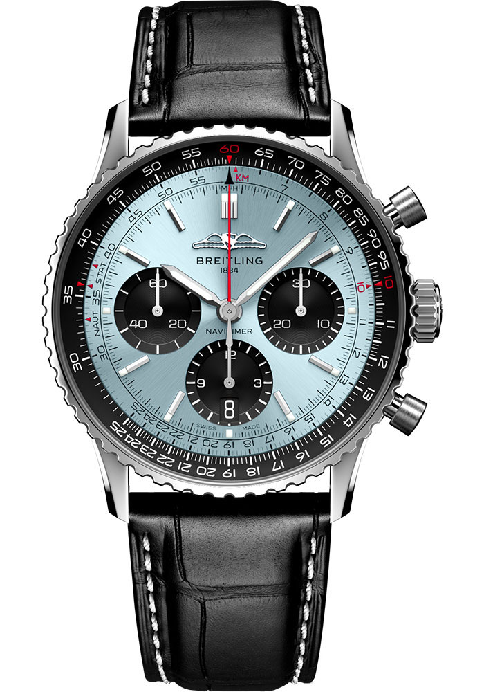 41.0 mm stainless steel case, 13.6 mm thick, transparent sapphire crystal back, non screw-locked crown with two gaskets, bidirectional slide rule bezel, cambered sapphire crystal with glareproof treatment on both sides, ice blue dial, Breitling 01 (Manufacture) self-winding movement, approximately 70 hrs of power reserve, black alligator leather strap, folding buckle. Water resistant to 3 bars.