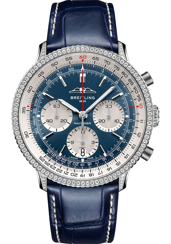 41.0 mm stainless steel (gem-set) case, 13.6 mm thick, transparent sapphire crystal back, non screw-locked crown with two gaskets, bidirectional slide rule bezel, cambered sapphire crystal with glareproof treatment on both sides, blue dial, Breitling 01 (Manufacture) self-winding movement, approximately 70 hrs of power reserve, blue alligator leather strap, folding buckle. Water resistant to 3 bars.