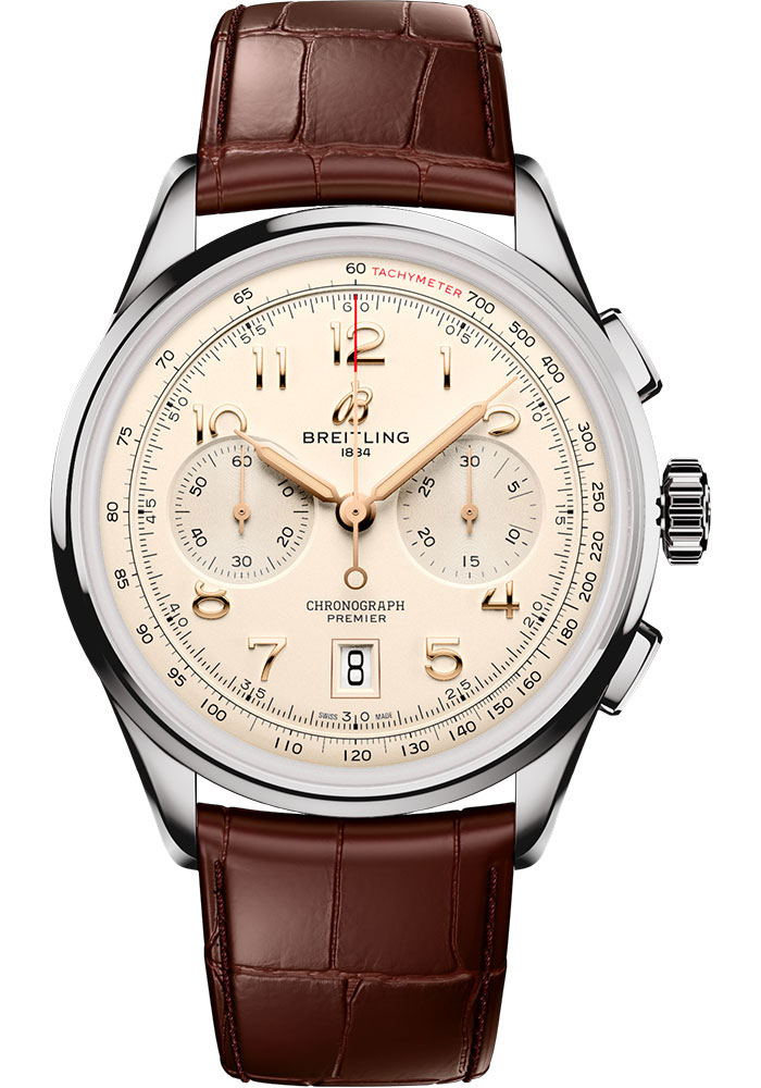 42.0 mm stainless steel case, 13.6 mm thick, transparent sapphire crystal back, non screw-locked crown with two gaskets, fixed bezel, cambered sapphire crystal with glareproof treatment on both sides, cream dial, Breitling 01 (Manufacture) self-winding movement, approximately 70 hrs of power reserve, brown alligator leather strap, folding buckle. Water resistant to 10 bars.