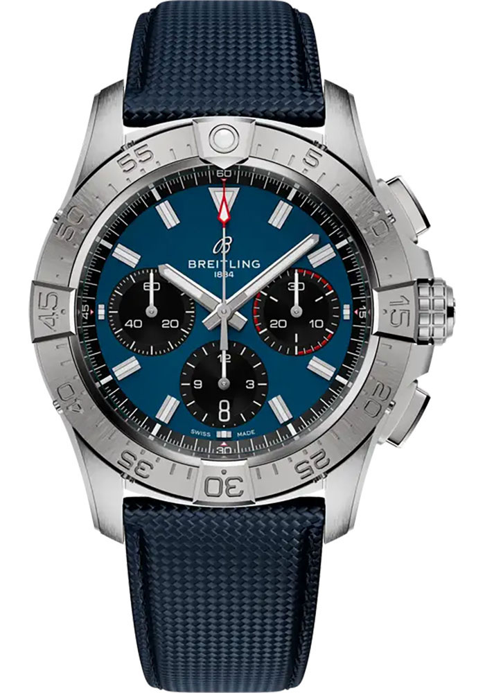 42.0 mm stainless steel case, 15.05 mm thick, transparent sapphire crystal back, screw-locked crown with two gaskets, unidirectional ratcheted bezel, cambered sapphire crystal with glareproof treatment on both sides, blue dial, Breitling 01 (Manufacture) self-winding movement, approximately 70 hrs of power reserve, blue calfskin leather strap, folding buckle. Water resistant to 300 m (1,000 ft).