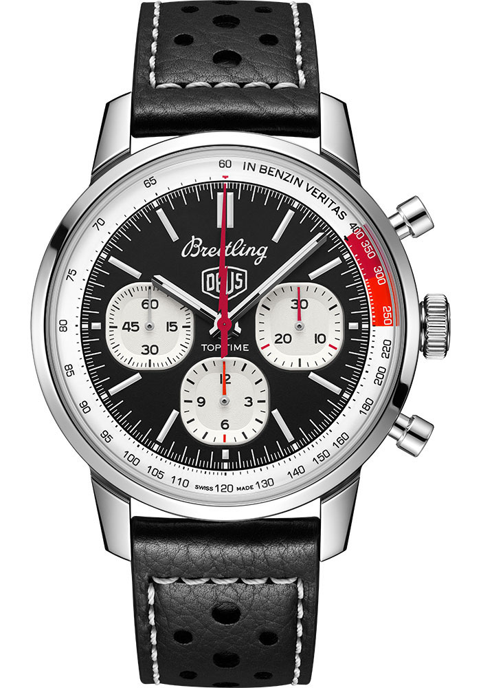 41.0 mm stainless steel case, 13.3 mm thick, transparent sapphire crystal back, non screw-locked crown with two gaskets, fixed bezel, cambered sapphire crystal with glareproof treatment on both sides, black dial, Breitling 01 (Manufacture) self-winding movement, approximately 70 hrs of power reserve, black calfskin leather strap, folding buckle. Water resistant to 10 bars.