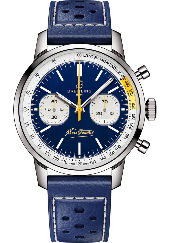 41 mm stainless steel case, 13.3 mm thick, transparent sapphire crystal back, non screw-locked crown with two gaskets, fixed bezel, blue dial, Breitling 01 (Manufacture) self-winding movement, approximately 70 hrs of power reserve, blue calfskin leather strap, folding buckle. Water resistant to 10 bars.
