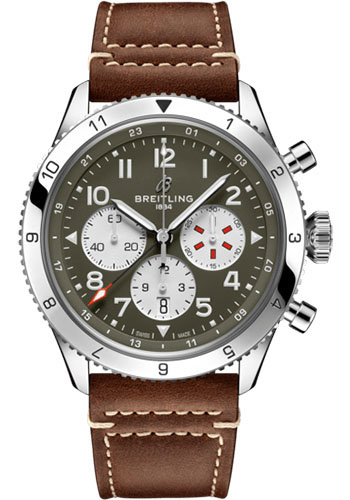 46.0 mm stainless steel case, 15.9 mm thick, transparent sapphire crystal back, screw-locked crown with two gaskets, bidirectional ratcheted bezel, black dial, Breitling B04 (Manufacture) self-winding movement, approximately 70 hrs of power reserve, brown calfskin leather strap, folding buckle. Water resistant to 100 m (330 ft).