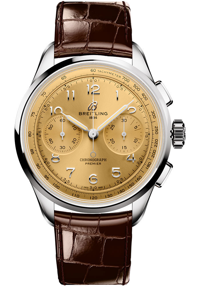40.0 mm stainless steel case, 13.0 mm thick, transparent sapphire crystal back, non screw-locked crown with two gaskets, fixed bezel, cambered sapphire crystal with glareproof treatment on both sides, champagne dial, Breitling B09 (Manufacture) mechanical hand-wound movement, approximately 70 hrs of power reserve, brown alligator leather strap, folding buckle. Water resistant to 10 bars.