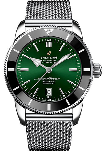 46.0 mm stainless steel case, 14.99 mm mm thick, screw-locked crown with two gaskets, unidirectional ratcheted rotating bezel, cambered sapphire crystal with glareproof treatment on both sides, green dial, Breitling B20 (Manufacture) selfwinding movement, approximately 70 hrs of power reserve, stainless steel bracelet. Water resistant to 200 m (660 ft).
