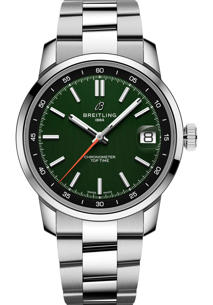 38 mm stainless steel case, 0 thick, transparent sapphire crystal back, non screw-locked crown with two gaskets, fixed bezel, cambered sapphire crystal with glareproof treatment on both sides, green dial, Breitling B31 (Manufacture) self-winding movement, approximately 78 hrs of power reserve, stainless steel bracelet. Water resistant to 10 bars.