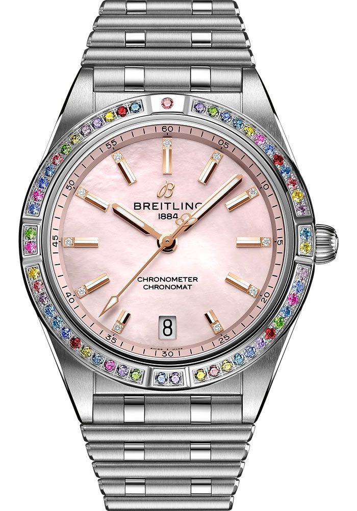 36.0 mm stainless steel and 18K white gold case, 10.0 mm thick, non screw-locked crown with two gaskets, cambered sapphire crystal with glareproof treatment on both sides, pink mother-of-pearl dial, Breitling 10 self-winding movement, approximately 42 hours of power reserve, stainless steel and 18K white gold bracelet. Water resistant to 10 bars.