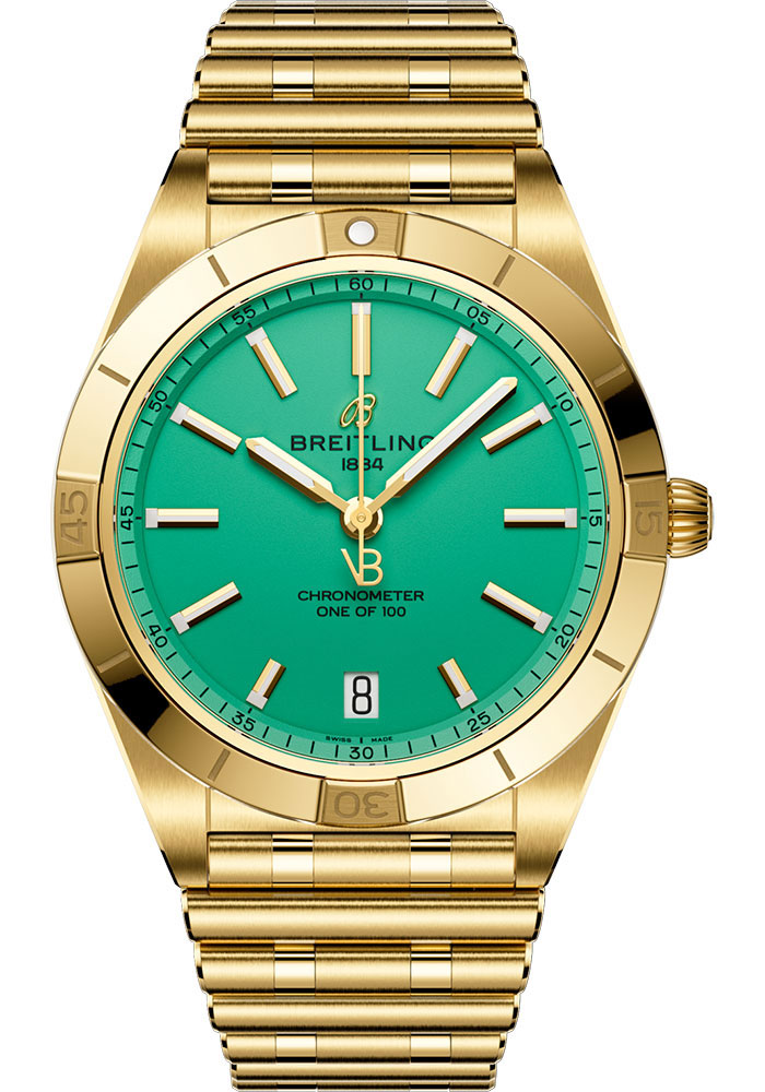 36.0 mm 18K yellow gold case, 10.0 mm thick, non screw-locked crown with two gaskets, unidirectional ratcheted bezel, cambered sapphire crystal with glareproof treatment on both sides, peppermint dial, Breitling 10 self-winding movement, approximately 42 hours of power reserve, 18K yellow gold bracelet. Water resistant to 10 bars.