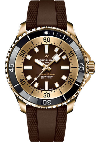 44.0 mm bronze case, 12.62 mm mm thick, screw-locked crown with two gaskets, unidirectional ratcheted bezel, cambered sapphire crystal with glareproof treatment on both sides, brown dial, Breitling 17 self-winding movement, approximately 38 hrs of power reserve, brown rubber strap, folding buckle. Water resistant to 300 m (1,000 ft).