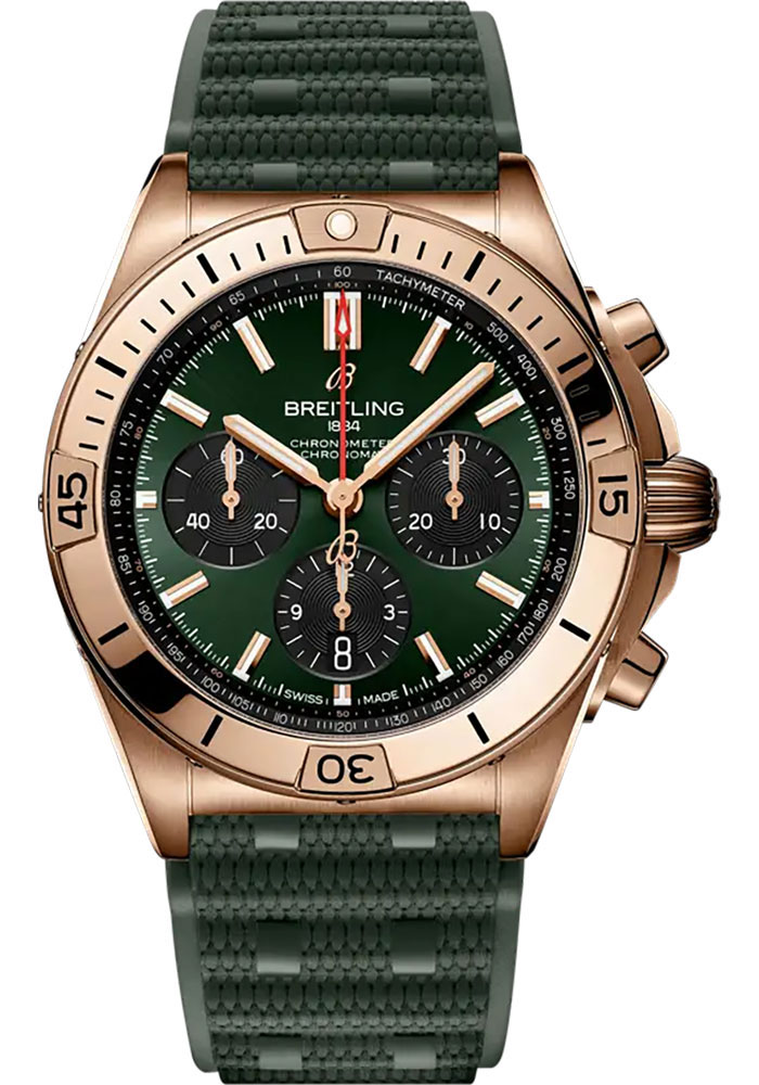 42.0 mm 18K red gold case, 15.10 mm thick, transparent sapphire crystal back, screw-locked crown with two gaskets, unidirectional ratcheted bezel, cambered sapphire crystal with glareproof treatment on both sides, green dial, Breitling 01 (Manufacture) self-winding movement, approximately 70 hrs of power reserve, green rubber strap, folding buckle. Water resistant to 200 m (660 ft).