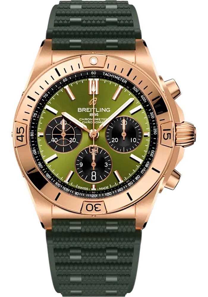 42.0 mm 18K red gold case, 15.10 mm thick, transparent sapphire crystal back, screw-locked crown with two gaskets, unidirectional ratcheted bezel, cambered sapphire crystal with glareproof treatment on both sides, green dial, Breitling 01 (Manufacture) self-winding movement, approximately 70 hrs of power reserve, green rubber strap, folding buckle. Water resistant to 200 m (660 ft). 18.
