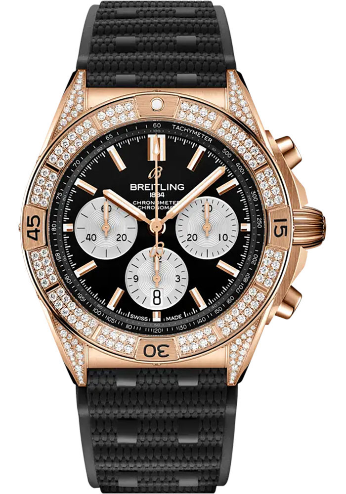 42.0 mm 18K red gold (gem-set) case, 15.10 mm thick, transparent sapphire crystal back, screw-locked crown with two gaskets, unidirectional ratcheted bezel, cambered sapphire crystal with glareproof treatment on both sides, black dial, Breitling 01 (Manufacture) self-winding movement, approximately 70 hrs of power reserve, black rubber strap, folding buckle. Water resistant to 200 m (660 ft).