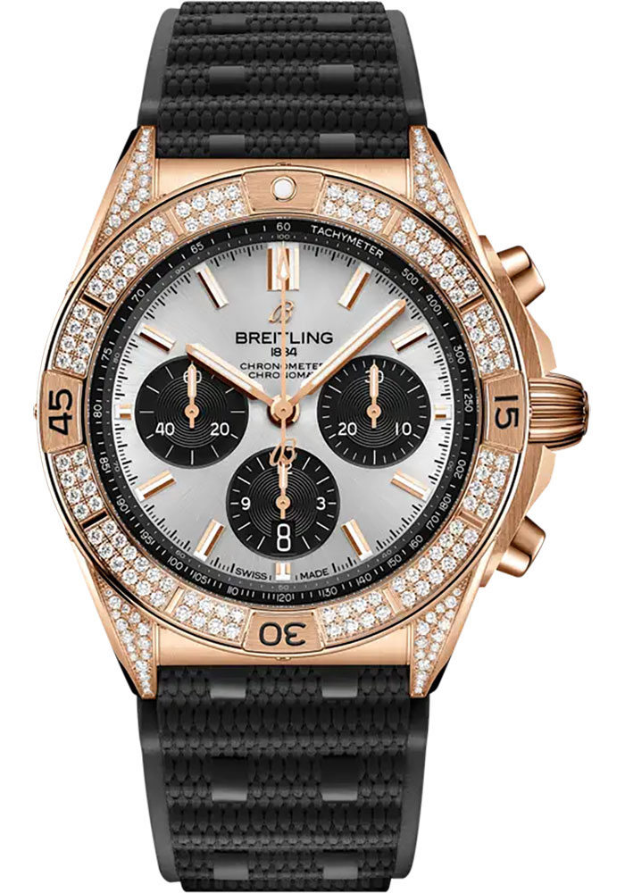 42.0 mm 18K red gold (gem-set) case, 15.10 mm thick, transparent sapphire crystal back, screw-locked crown with two gaskets, unidirectional ratcheted bezel, cambered sapphire crystal with glareproof treatment on both sides, cream dial, Breitling 01 (Manufacture) self-winding movement, approximately 70 hrs of power reserve, black rubber strap, folding buckle. Water resistant to 200 m (660 ft).
