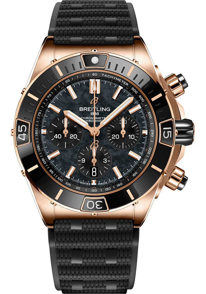 44 mm 18K red gold case, 14.45 mm thick, transparent sapphire crystal back, screw-locked crown with two gaskets, unidirectional ratcheted rotating bezel, sapphire crystal with glareproof treatment on both sides, black-mother-of-pearl dial, Breitling 01 (Manufacture) self-winding movement, approximately 70 hrs of power reserve, black rubber strap, folding buckle. Water resistant to 200 m (660 ft).