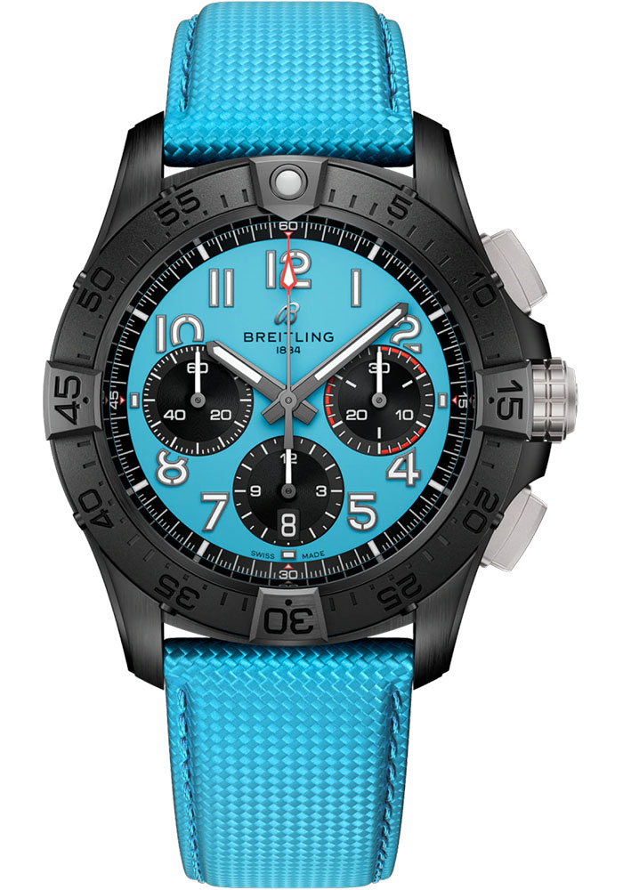 42 mm ceramic case, 15.15 mm thick, screw-locked crown with two gaskets, unidirectional ratcheted bezel, cambered sapphire crystal with glareproof treatment on both sides, turquoise dial, Breitling 01 (Manufacture) self-winding movement, approximately 70 hrs of power reserve, turquoise calfskin leather strap, folding buckle. Water resistant to 300 m (1,000 ft).