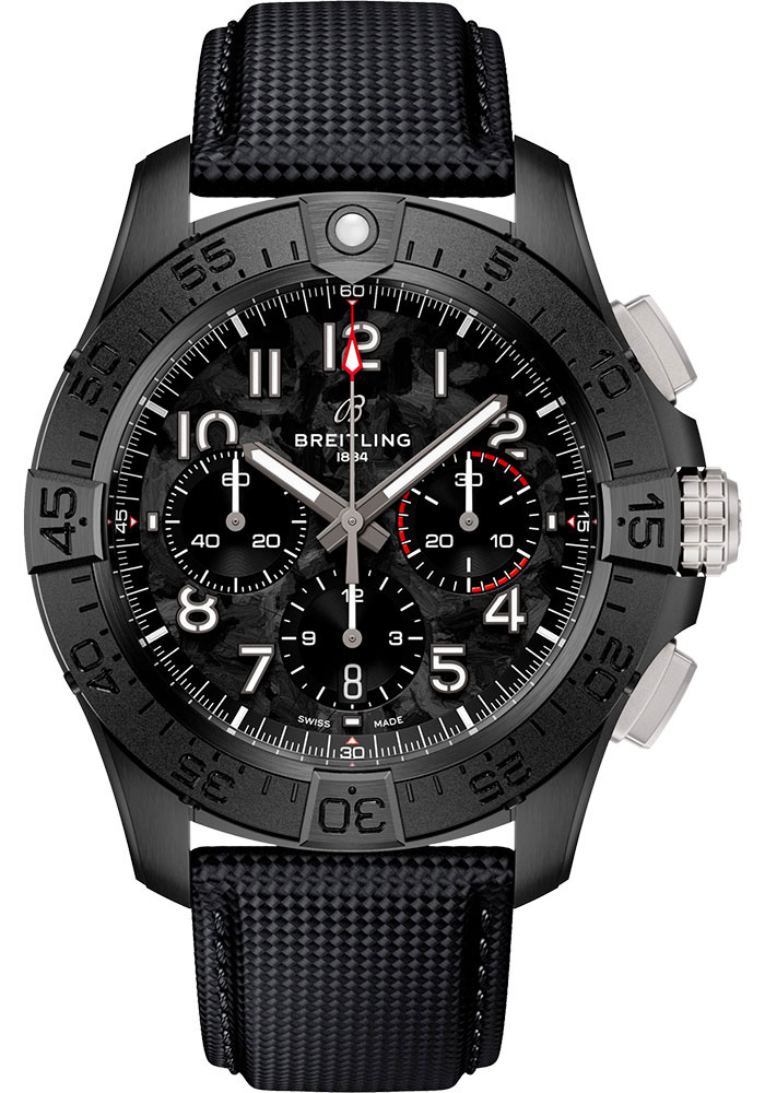 44.0 mm ceramic case, 15.2 mm thick, screw-locked crown with two gaskets, unidirectional ratcheted bezel, cambered sapphire crystal with glareproof treatment on both sides, carbon dial, Breitling 01 (Manufacture) self-winding movement, approximately 70 hrs of power reserve, black calfskin leather strap, folding buckle. Water resistant to 300 m (1,000 ft).
