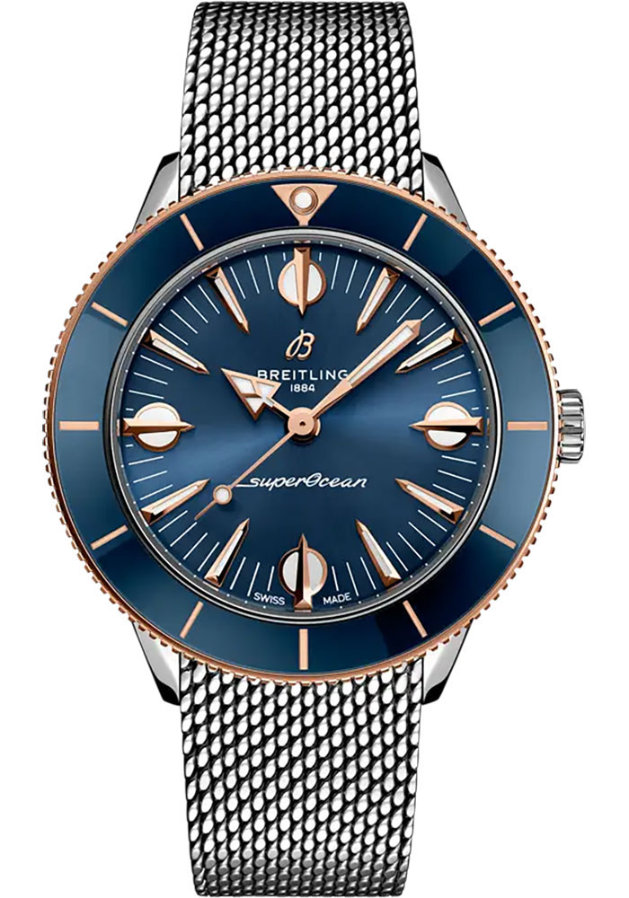38.0 mm stainless steel and 18K red gold case, 9.35 mm thick, non screw-locked crown with two gaskets, bidirectional ratcheted bezel, cambered sapphire crystal with glareproof treatment on both sides, blue dial, Breitling 10 self-winding movement, approximately 42 hours of power reserve, stainless steel bracelet, folding buckle. Water resistant to 10 bars.