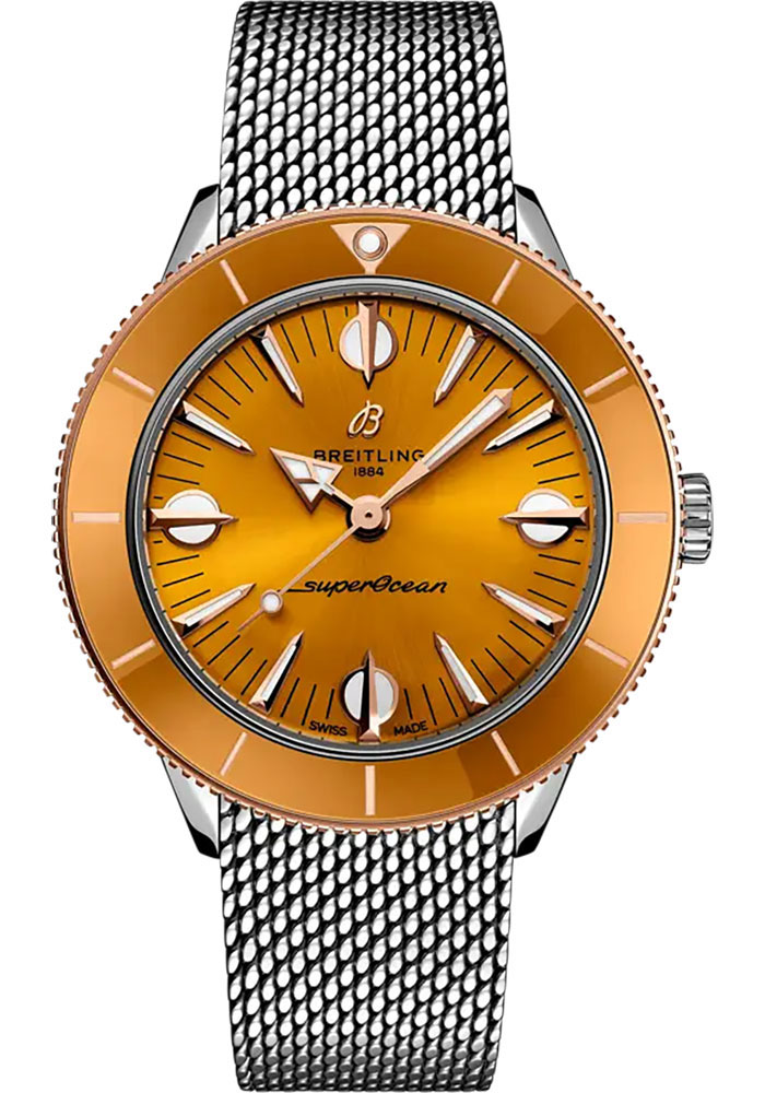 38.0 mm stainless steel and 18K red gold case, 9.35 mm thick, non screw-locked crown with two gaskets, bidirectional ratcheted bezel, cambered sapphire crystal with glareproof treatment on both sides, mustard dial, Breitling 10 self-winding movement, approximately 42 hours of power reserve, stainless steel bracelet, folding buckle. Water resistant to 10 bars.