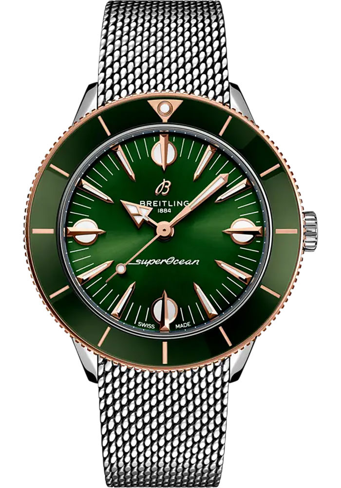 38.0 mm stainless steel and 18K red gold case, 9.35 mm thick, non screw-locked crown with two gaskets, bidirectional ratcheted bezel, cambered sapphire crystal with glareproof treatment on both sides, green dial, Breitling 10 self-winding movement, approximately 42 hours of power reserve, stainless steel bracelet, folding buckle. Water resistant to 10 bars.