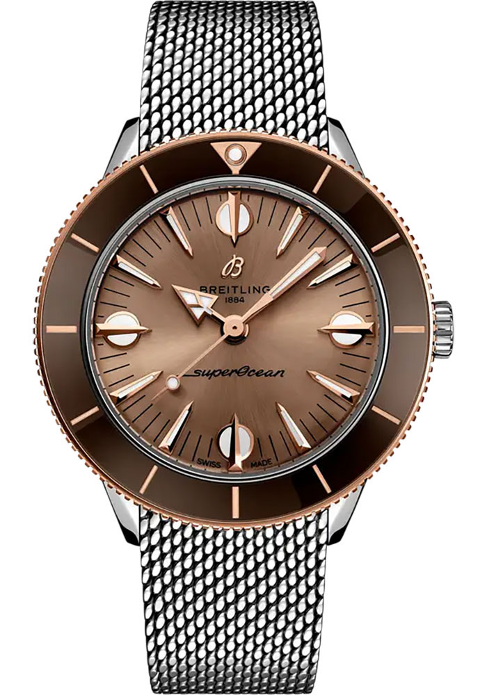 38.0 mm stainless steel and 18K red gold case, 9.35 mm thick, non screw-locked crown with two gaskets, bidirectional ratcheted bezel, cambered sapphire crystal with glareproof treatment on both sides, beige dial, Breitling 10 self-winding movement, approximately 42 hours of power reserve, stainless steel bracelet, folding buckle. Water resistant to 10 bars.