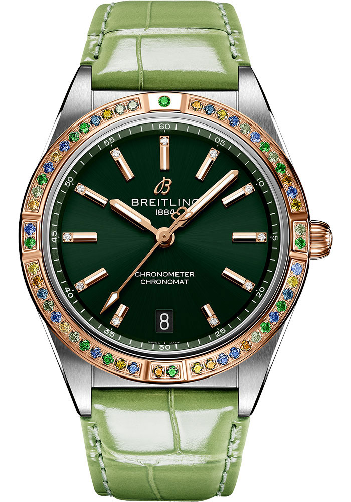 36.0 mm stainless steel and 18K red gold case, 10.0 mm thick, non screw-locked crown with two gaskets, cambered sapphire crystal with glareproof treatment on both sides, green dial, Breitling 10 movement, green alligator leather strap, folding buckle.