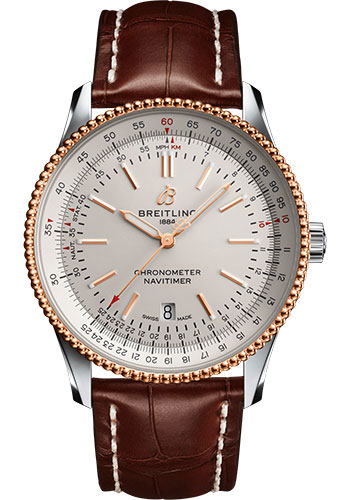 41.00 mm steel and red gold case, 10.00 mm thick, non screw-locked crown with two gaskets, bidirectional slide rule bezel, cambered sapphire crystal with glareproof treatment on both sides, silver dial, Breitling 17 self-winding movement, approximately 38 hrs of power reserve, brown croco strap, tang buckle. Water resistant to 3 bars.