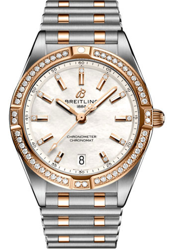 32.0 mm stainless steel and 18K red gold (gem-set) case, 8.5 mm thick, non screw-locked crown with two gaskets, fixed bezel, cambered sapphire crystal with glareproof treatment on both sides, mother-of-pearl dial, Breitling 77 SuperQuartz™ movement, stainless steel and 18K red gold bracelet. Water resistant to 100 m (330 ft).