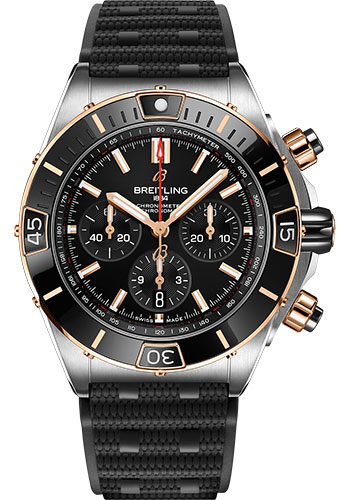 44.0 mm stainless steel and 18K red gold case, 14.45 mm mm thick, transparent sapphire crystal back, screw-locked crown with two gaskets, unidirectional ratcheted rotating bezel, sapphire crystal with glareproof treatment on both sides, black dial, Breitling 01 (Manufacture) self-winding movement, approximately 70 hrs of power reserve, black rubber strap, folding buckle. Water resistant to 200 m (660 ft).