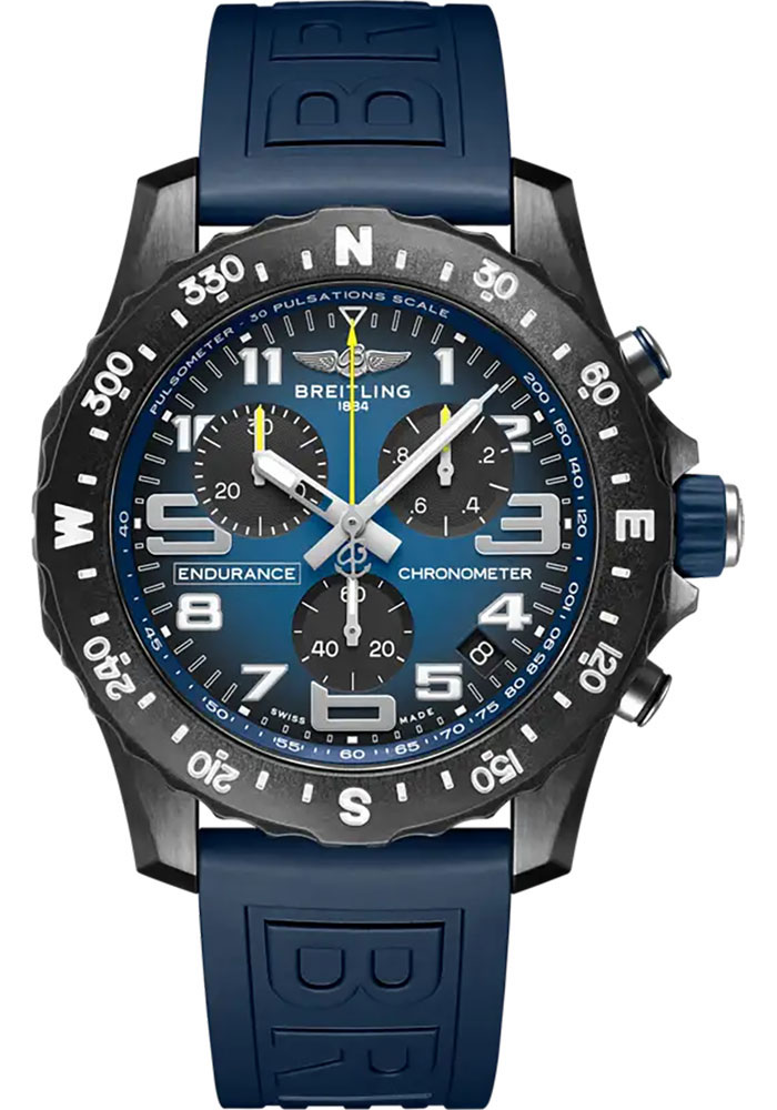 44.0 mm Breitlight case, 12.50 mm thick, non screw-locked crown with two gaskets, bidirectional compass scale bezel, sapphire crystal with glareproof treatment on both sides, blue dial, Breitling 82 thermocompensated SuperQuartz™ movement, blue rubber strap, tang buckle. Water resistant to 10 bars.