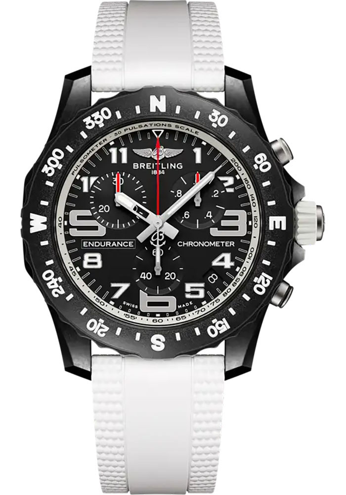 44.0 mm Breitlight case, 12.50 mm thick, non screw-locked crown with two gaskets, bidirectional compass scale bezel, sapphire crystal with glareproof treatment on both sides, black dial, Breitling 82 thermocompensated SuperQuartz™ movement, white rubber strap, tang buckle. Water resistant to 10 bars.
