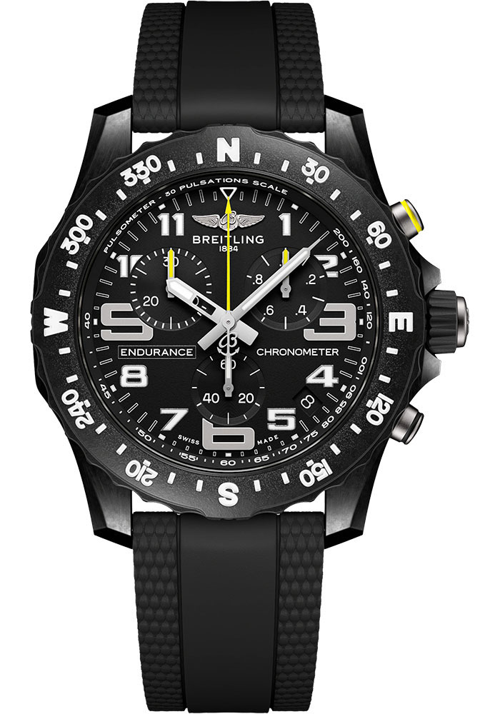 44 mm Breitlight case, 12.5 mm thick, non screw-locked crown with two gaskets, bidirectional compass scale bezel, sapphire crystal with glareproof treatment on both sides, black dial, Breitling 82 thermocompensated SuperQuartz™ movement, black rubber strap, tang buckle. Water resistant to 10 bars.